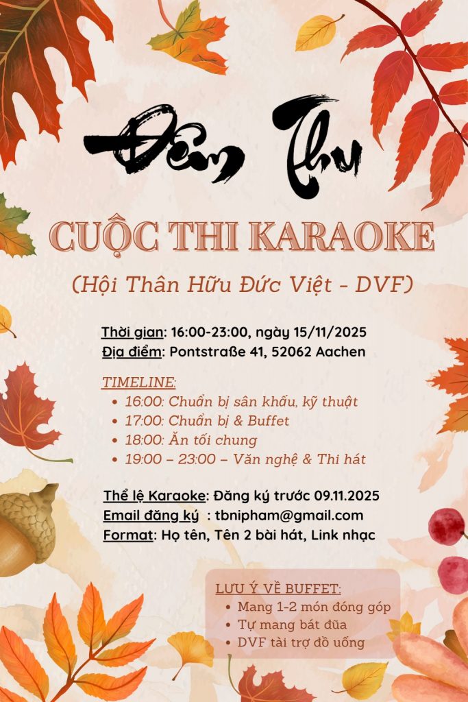 Trong tinh thần đó, mong các anh chị, các bạn, các cháu ghi tên sớm, hạn chót là ngày 09.11.2025 (BTC còn phải lên chương trình, BGK chuẩn bị…tinh thần…). Do thời gian có hạn, BTC chỉ nhận đăng ký tối đa là 16 người ghi tên sớm nhất. Mọi đăng ký (gồm họ tên người dự thi, tên 2 bài hát, tác giã và Link bài hát, dạng Karaoke hoặc là nhạc nền mp3 mà bạn muốn hát) và thắc mắc, xin gởi về chị Ni: tbnipham@gmail.com